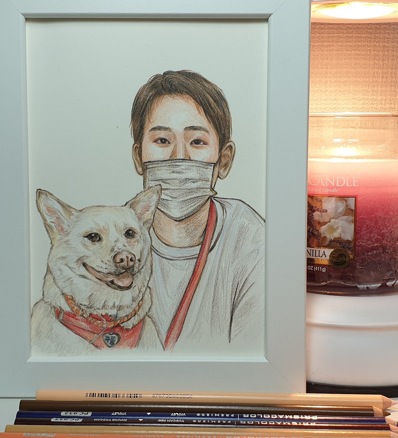 남자분 사진을 그리기 시작하자 궁금증은 더욱 커졌다. 두 번째 사진 속 반려견은 하트 목걸이를 하고 있었고, 흐릿하게 글씨가 보였는데, 아마도 이름표 목걸이인 듯했다. 반려견을 양손으로 안아주듯 일으켜 세워 앞발이 들린 채 함께 정면을 보고 있는 사진을 자세히 관찰하며 정성껏 그려 나갔다. 빨간색 이름표 목걸이와 빨간색 개줄이 흰 털과 대비되어 진돗개의 용감하고, 맹렬함이 더욱 느껴졌고, 까많고 커다란 눈은 오랜 세월 속에 눈꺼풀이 쳐져서 선해 보였다.