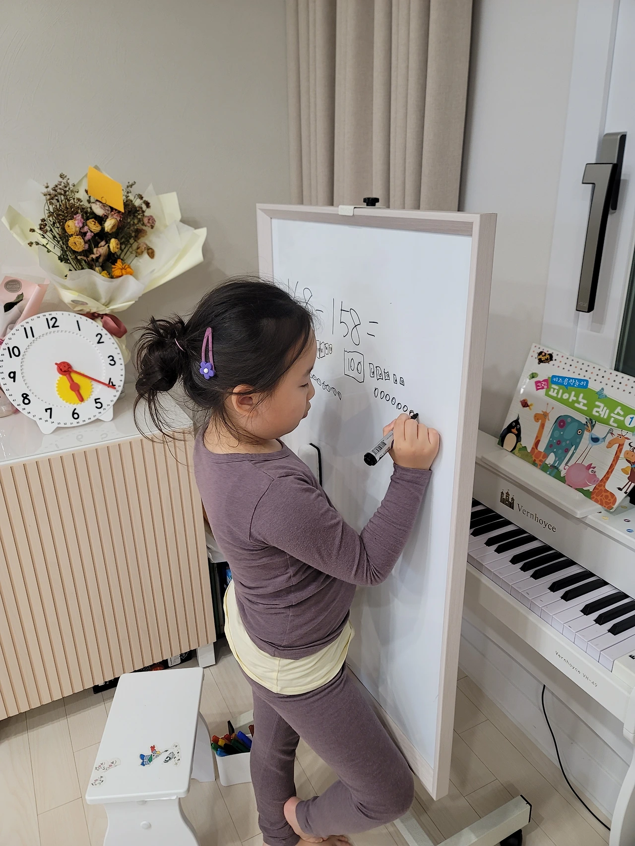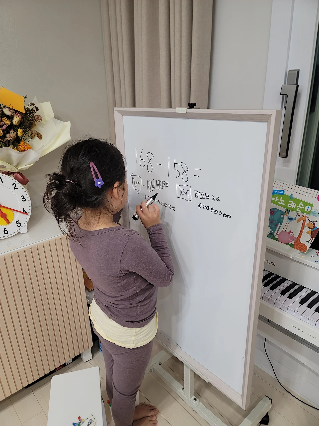 수모형으로 문제를 158-120을 풀어낸 달달이에게 새로운 문제를 하나 더 제시했다. 과연 혼자 풀 수 있을 것인가! 조금 어려워하긴 했지만 스스로 풀어냈다. 이렇게 세 자릿수 연산에 대해서도 한 걸음 다가가게 되었구나. 내일은 스스로 문제를 내고 풀어보고 설명까지 해보라고 해야지!