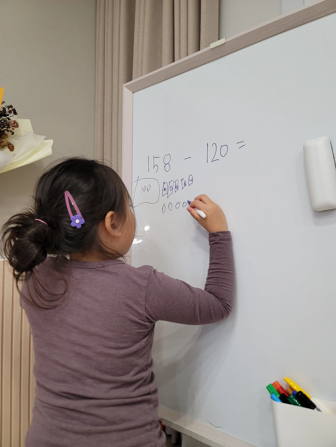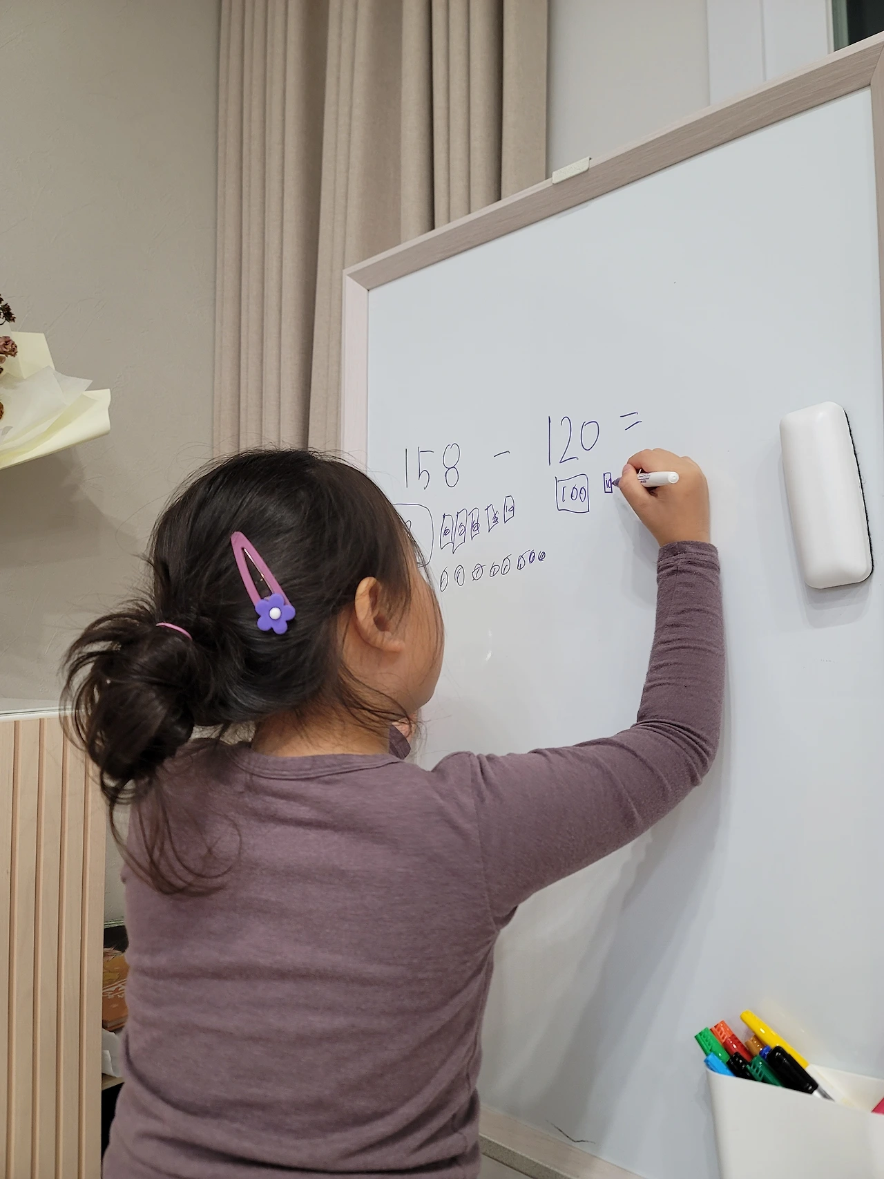 자릿값.. 예전에 많이 하지 않았니..? 하는 마음이 마음속에 차올랐지만 오늘도 잘 참았다. 그래 오래되었으니 까먹었을 수 있지. 158은 100이 몇 개일까? 10은 몇 개일까? 1은 몇 개일까? 하나하나 얘기해 주니 예전 기억이 떠올랐나 보다. 힘들었지만 스스로 칠판에 '158-120='을 적었다. 그런데 이걸 어떻게 하라고? 엄마가 뭐 하자는 거지? 하는 알 수 없다는 눈빛으로 나를 쳐다보는 아이였다.