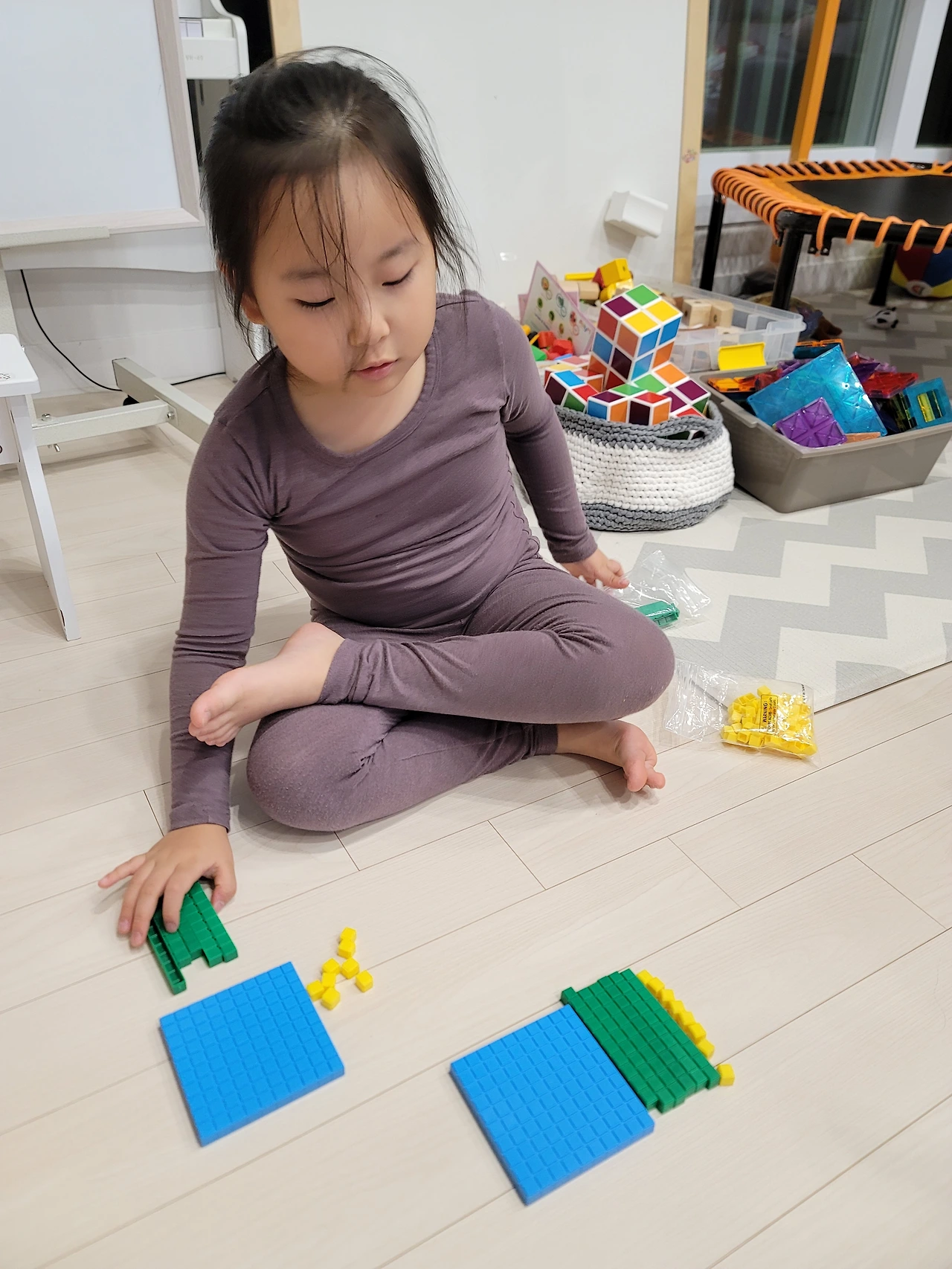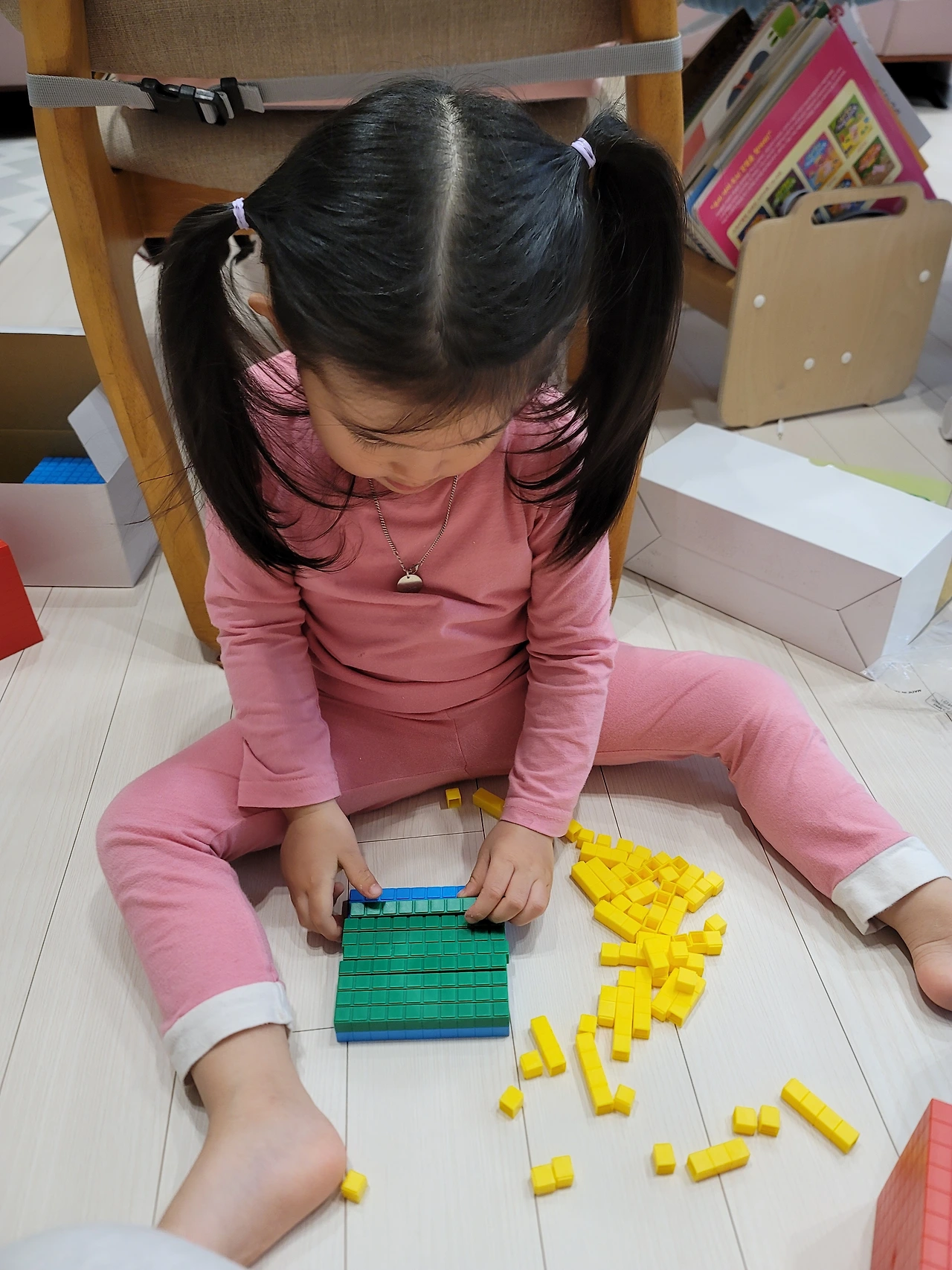 세 자릿수 연산이라고 하면 세로셈부터 시작하는 아이들이 많다. 자릿수의 개념도 잡히지 않은 채로 그냥 위에서 아래를 빼면 연산이 된다고 생각하는 아이가 정말 많다. 하지만 그렇게 해서는 제대로 된 개념이 잡히지 않는다. 수학은 항상 말하지만 우리 주변에 있다. 중, 고등학교 친구들에게 교구로 개념을 잡으라는 얘기는 하지 않는다. 하지만 유아시기만큼은 주변에 있는 것들로 구체물에서 반구체 물로, 숫자로 조금씩 확장하며 개념을 잡아갔으면 좋겠다.