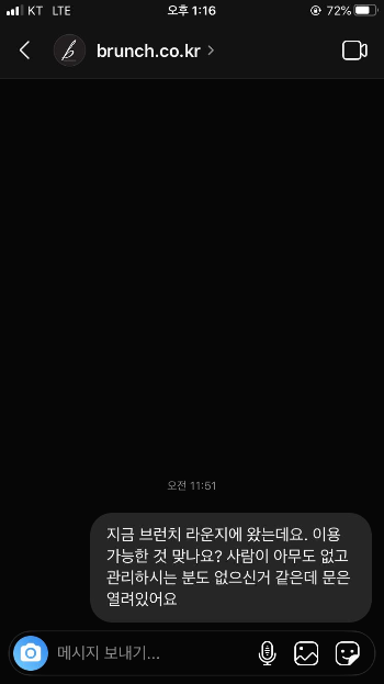 주인 없는 집에 함부로 들어가는 것 아니라고 배운 나는 급한 대로 브런치 공식 인스타그램 계정에 DM을 보내보기로 했다.