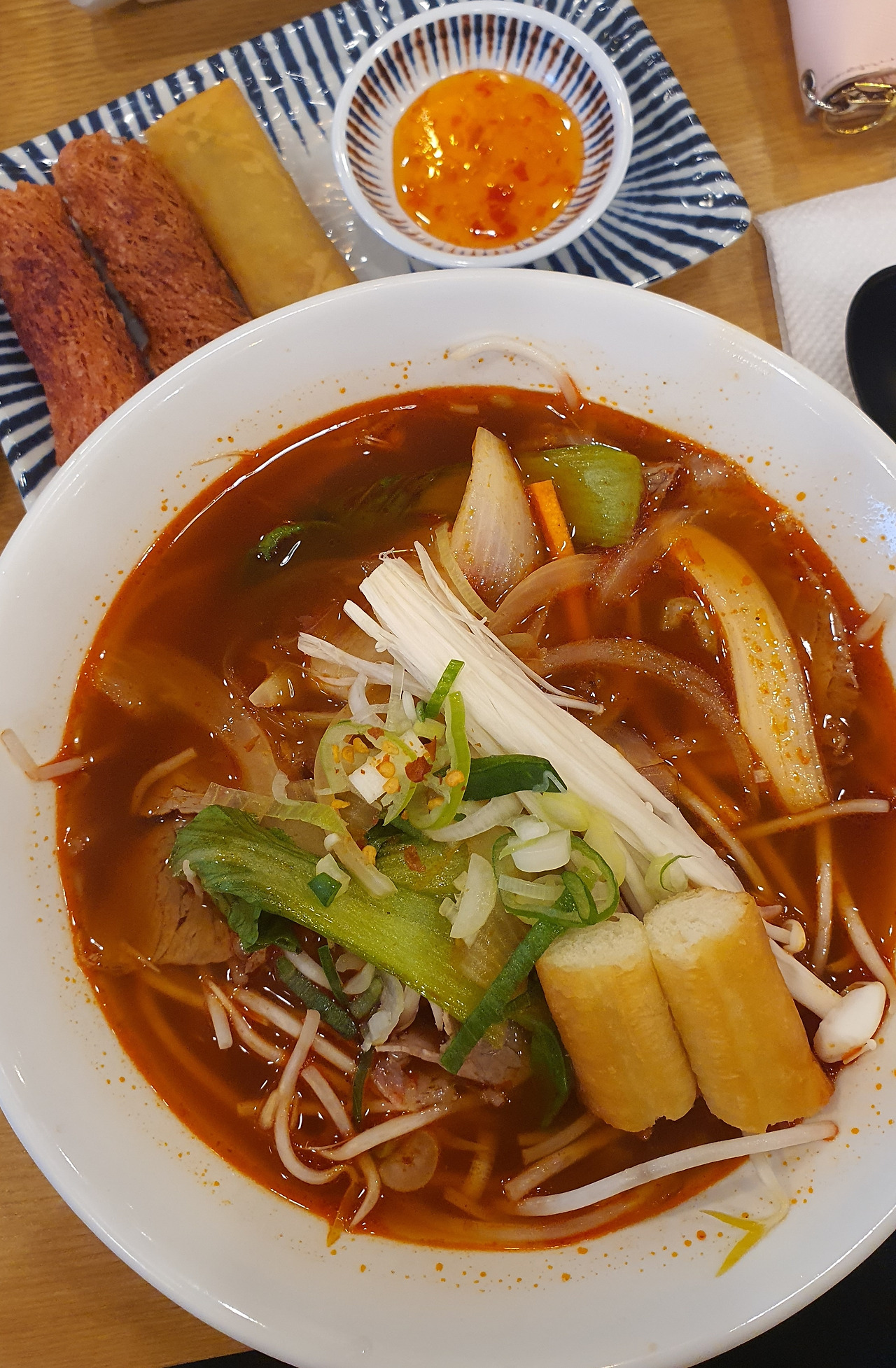 짬뽕처럼 붉은 빛깔에 얼큰한 냄새가 느껴지는 국물이 시각을 마구 자극한다. 처음에는 예상을 뛰어넘는 매움 그리고 뜨거움에 주춤하게 된다. 국물을 쉽사리 떠먹지는 말고 둘레의 숙주와 청경채만 집어 먹으며 온도가 내려가기를 기다려야 한다. 너무 뜨거우면 안 그래도 매운맛이 더 맵게 느껴지고, 음식 본연의 맛도 잘 느껴지지 않기 때문이다. 세트로 나온 달콤하고 바삭한 고구마롤, 튀김 만두 넴(혹은 짜조)을 먹고 있는 것도 좋은 방법이다. 물론 다 먹으면 안 된다. 중간중간 매울 때 한 입씩 먹어줘야 입안을 진정시킬 수 있다.