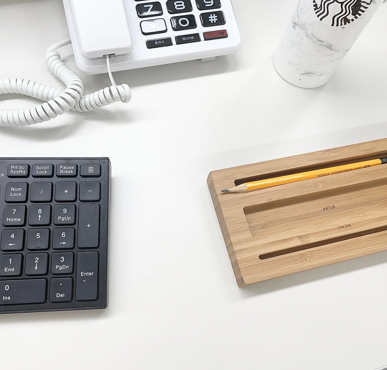 집에서와 마찬가지로 회사에서도 플라스틱을 조금씩 줄여나가고 있다. 회사에서 쓰는 사무 도구들을 나무 용기에 담고, 양치를 할 때도 대나무 칫솔과 고체 치약을 쓴다. 핸드타월 대신 손수건을 쓰고부터 휴지 사용량도 많이 줄었다.