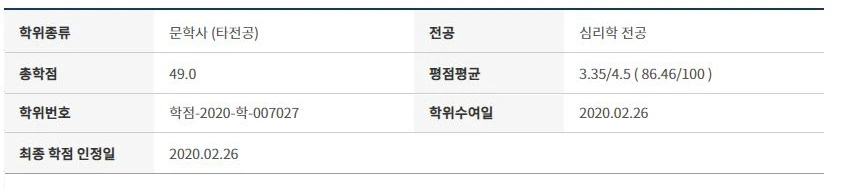 학점은행제에 학위신청을 하고, 얼마가 지나자 학점인정과 학위 수여를 받게 되었다. 1년간 공부한 끝에 나에게는 또 하나의 전공이 생겼다. 하지만 심리학은 학위를 땄다고 끝나는 분야가 아닌 것 같다. 평생 옆에 두고 공부하고 싶은 학문이다. 모든 일은 사람의 심리로부터 시작해서 사람의 심리로 끝나기 때문이다.