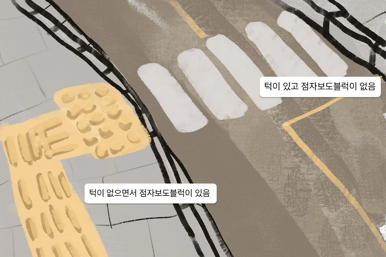그런데 이상하게도 내가 가던 길에는 위 그림의 좌측처럼 턱이 없으면서 점자보도블록이 있었고, 그에 반대편에는 턱이 높이 있고 점자보도블록이 없는 길이었다.