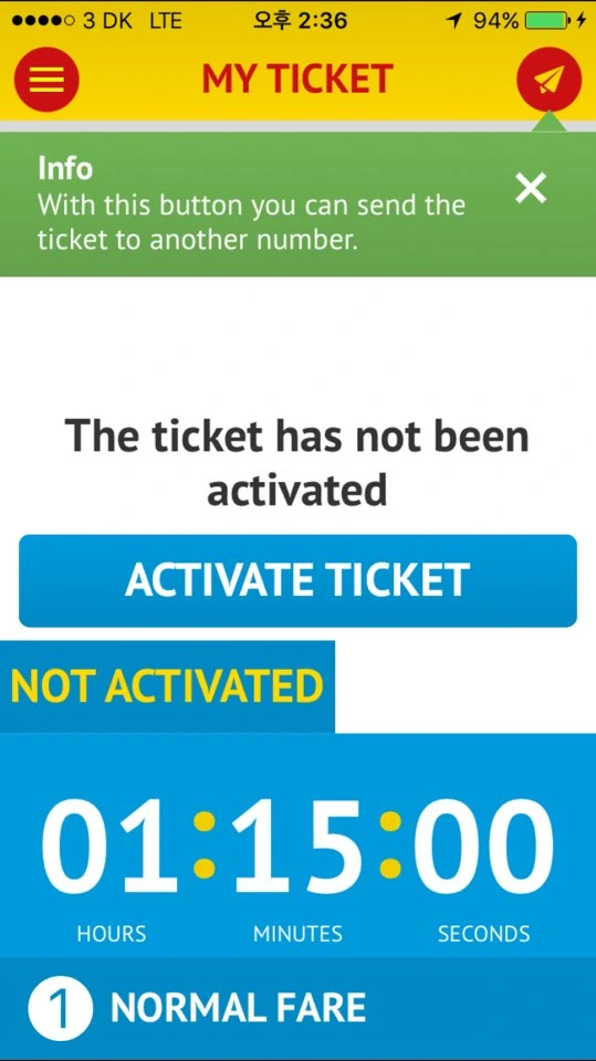 4. 버스 기사가 앱 화면에 있는 'Activate Ticket'이라는 버튼을 누르면, 1시간 30분짜리 타이머가 가동되며 탑승처리가 완료된다. (1시간 30분 안에 버스를 갈아탈 경우, 추가적으로 티켓 구매 없이 해당 티켓 화면을 다시 보여주는 방식으로 승차 가능하다.)
