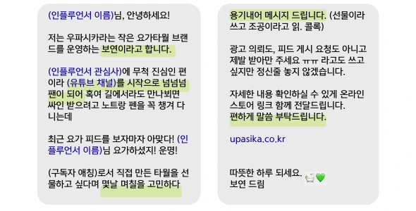 우리 브랜드와 잘 맞는 인플루언서를 찾았다면, 이제는 거절당하기 어려운(!) 정성스러운 메시지를 보낼 때입니다. 누구에게나 보낼 것 같은 '스팸형' 메시지로 인플루언서를 설득하기엔 무리가 있겠죠. 친환경 리사이클 매트타월 브랜드, "우파시카"는 정성스러운 DM으로, 6만 이상의 팔로워를 보유한 인플루언서에게 제품 협찬을 하게 됐다고 해요.