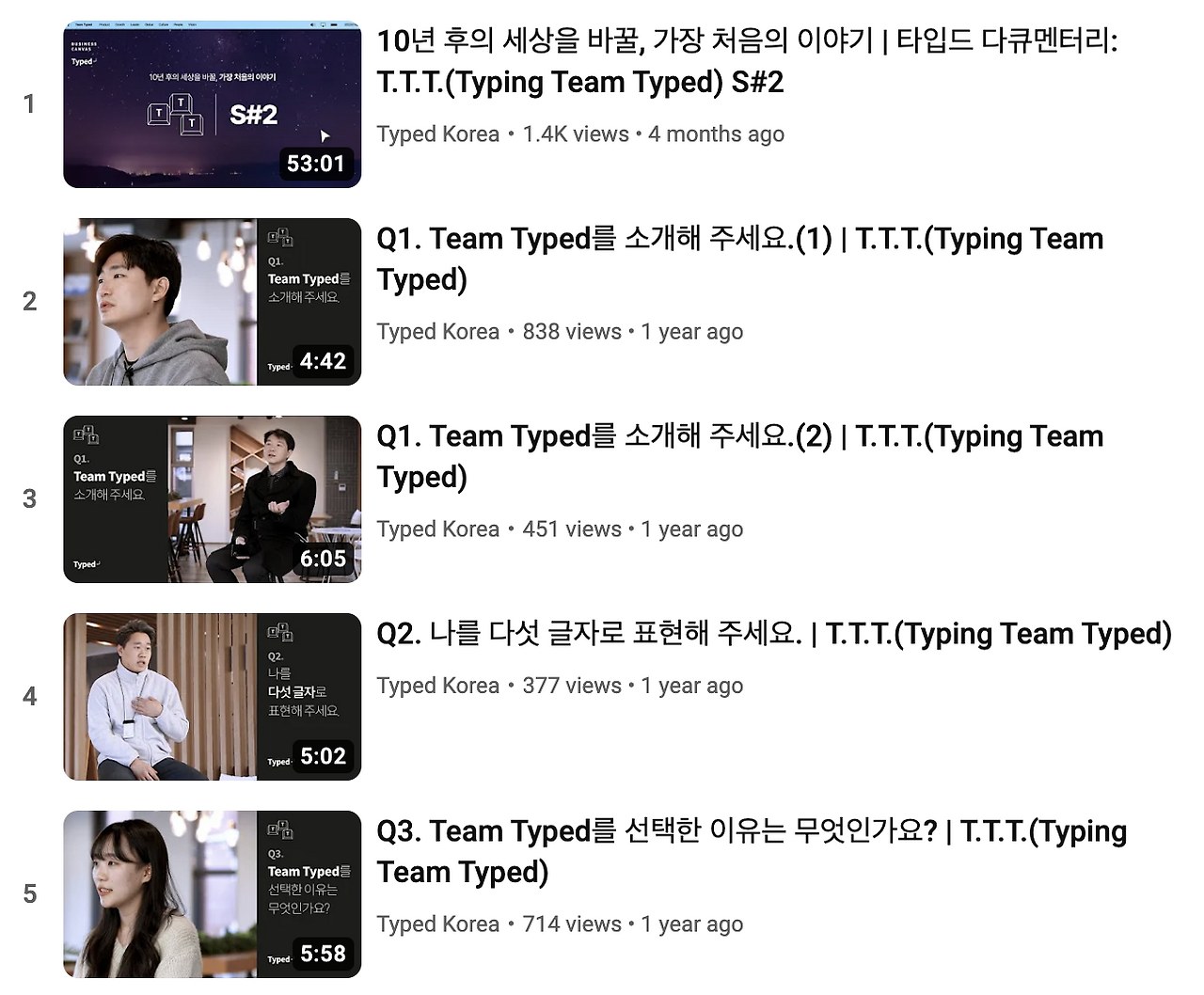 게다가 타입드는 타 플랫폼뿐만 아니라 자체 플랫폼인 블로그와 유튜브, 그리고 웨비나에서도 여러 직원들의 목소리와 전문성을 선보이는 자리를 마련하는데요. 타입드 블로그 또한 플라네타리움의 블로그처럼, 인턴부터 대표까지 다양한 필진이 직접 작성한 포스팅이 공개되어 있고요. 유튜브에는 직원들이 직접 타입드를 소개하는 'Typing Team Typed' 콘텐츠를 따로 시리즈물화하여 만들어두었습니다. 해당 시리즈는 2022년 타입드의 다큐멘터리로 만들어지기도 했죠.