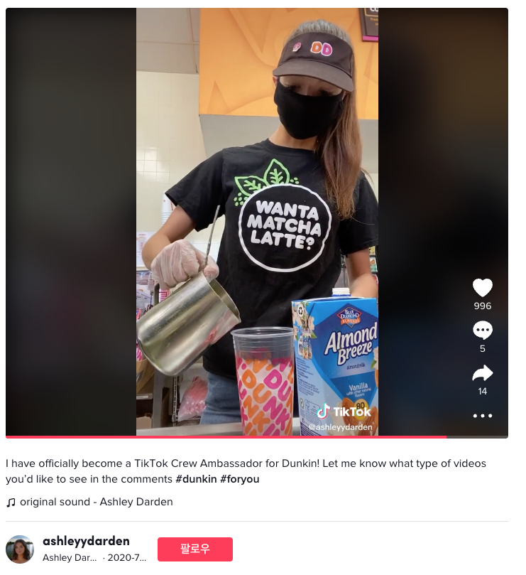 아래의 영상도 해당 앰베서더 프로그램에 선별된 직원이 직접 만들어 올린 영상이라고 해요. 던킨의 공식적인 목소리를 낸 콘텐츠가 아닌, 직원의 목소리를 활용하기 때문에 더 많은 고객들이 관심을 가질 수밖에 없습니다. 던킨의 직원인 Ashley Darden의 계정만 해도 6만 명이 넘는 팔로워를 보유하고 있을 정도로, Crew Ambassador 프로그램의 마케팅 파급력은 매우 크죠.