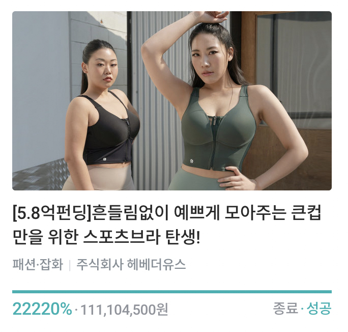 이 제품도 얼마 전 와디즈에서 펀딩을 진행했는데, 1억 1천만 원이 넘는 펀딩 금액을 모았습니다. 헤베더유스가 큰 컵 스포츠 브라를 만든 이유에 공감해 주시고 저희를 믿고 다시 펀딩 해주신 수많은 서포터님들의 댓글을 보고 다시 한번 큰 힘을 얻었죠.