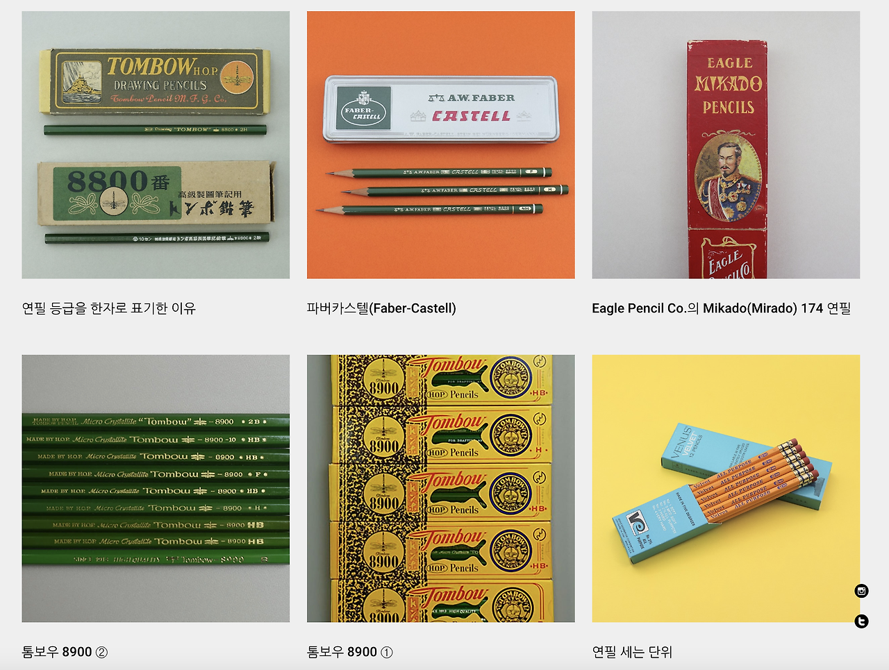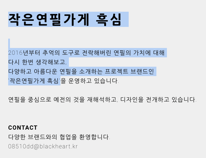 오래된 연필과 이야기를 선보이는 작은 브랜드, '연필가게 흑심'의 자사몰은 오프라인 매장을 연상시킬만큼 다양한 연필에 대한 콘텐츠로 구성되어 있습니다.