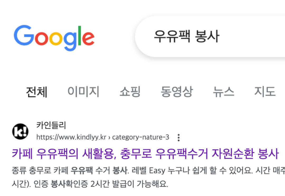 카인들리의 방문자가 증가한 비결 중 하나는 '뉴스룸'이라는 자사몰 메뉴에서 매력적으로 선보인 봉사활동 관련 블로그 콘텐츠에 있었다고 해요. 해당 콘텐츠 덕에 구글에서 ‘우유팩 봉사’, ‘서울숲 플로깅’, ‘앰부 봉사’, ‘유기묘 봉사’ 등의 키워드를 검색하면, 카인들리 웹사이트가 상위에 노출되는 것을 볼 수 있는데요.