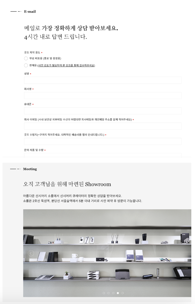채팅 서비스, 전화, 메일, 쇼룸 미팅의 무려 4가지 옵션을 제안합니다. 이는 고객에게 적극적으로 다가가는 신시어리의 적극성을 대변하는데요. 다양한 고객의 성향에 모두 맞춘 4가지 옵션을 제공하니, 고객은 신시어리를 좋은 옵션으로 고려할 수 밖에 없겠죠.