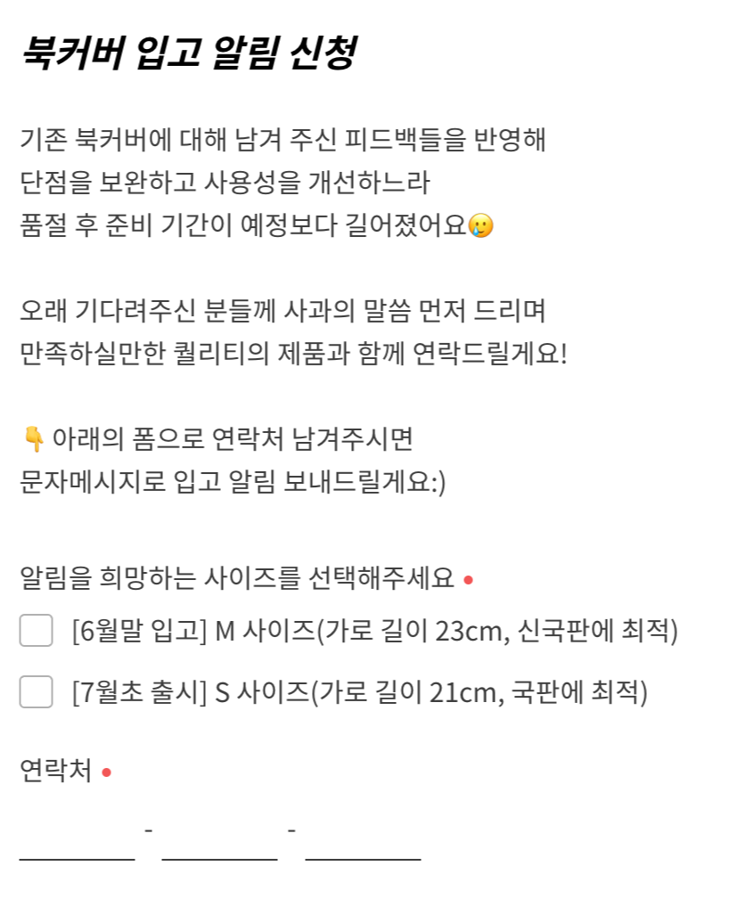 최근 리나린에서 론칭한 북커버는 1차 물량이 빠르게 소진되었고, 다양한 피드백이 있었다고 하는데요. 고객의 피드백을 반영해 2차 물량을 론칭하고 싶어 웹사이트에 알림 신청을 설정해두었다고 합니다.