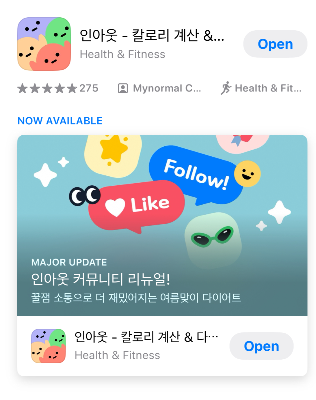 실패의 쓴맛을 본 후, 개발팀과 함께 어떤 서비스를 만들어볼지 논의했어요. 그리고 2022년 1월, 칼로리 계산기와 다이어트 배틀 기능을 더한 커뮤니티 플랫폼인 ‘인아웃'을 론칭했습니다. 정말 감사하게도 인아웃은 현재 6만 명이 넘는 일일활성사용자(DAU)를 보유한 1위 칼로리 계산기 앱이 되었고요. 광고 서비스가 매출로 전환되면서 가능성 있는 신사업으로 자리 잡게 되었습니다. 아무래도 건강 고관여 사용자들이 인아웃에 모여있기 때문에, 광고 클릭률도 20%를 웃도는 수준으로 무척 높아, 초반에 그렸던 사업 구조가 조금씩 현실화되고 있는 단계입니다.