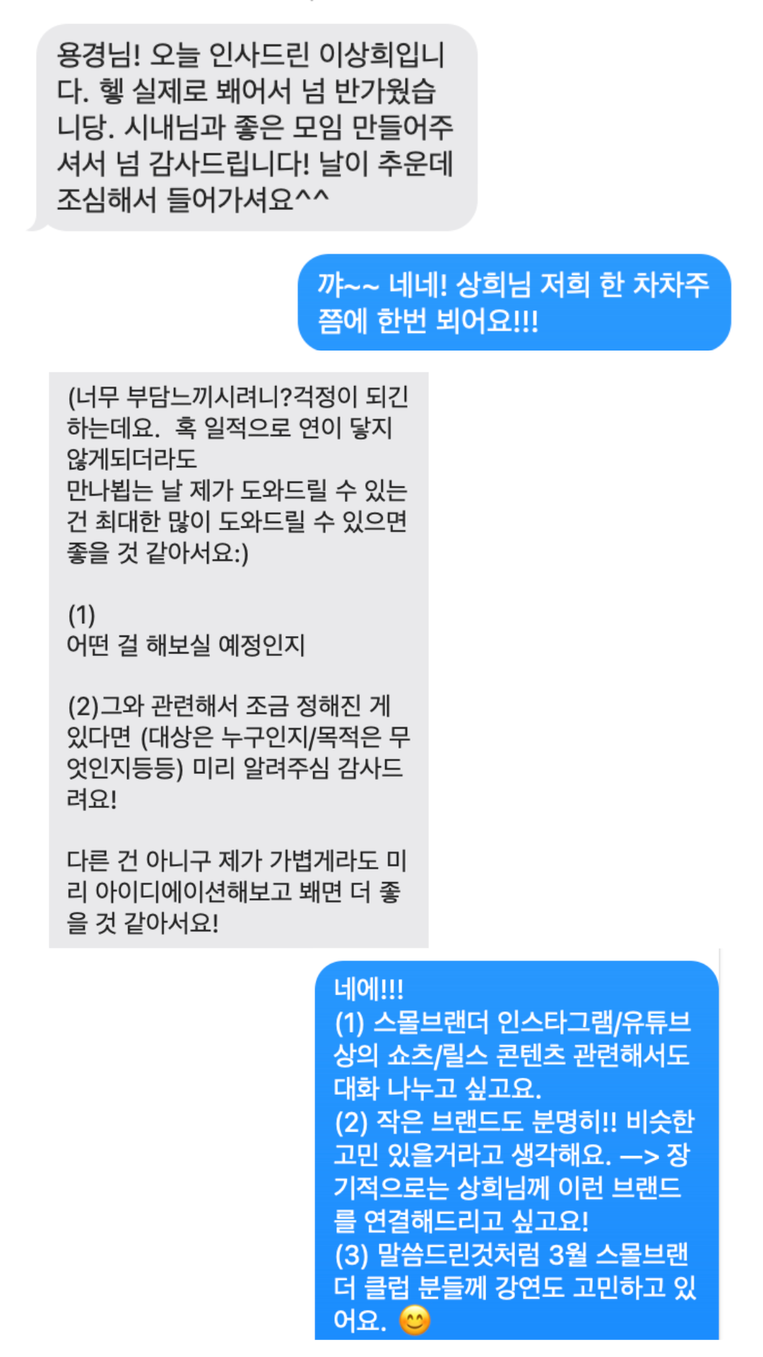 실제로 스몰브랜더도 비슷한 방식으로 숏폼 콘텐츠 전문가 '상희'와 연결되었습니다. 스몰브랜더가 직접 주최한 행사에서 인성과 실력 모두 훌륭해보이는 상희를 발견하고 스몰브랜더에게 꼭 필요했던 숏폼 분야를 채워줄거란 확신이 들어 커피챗을 적극적으로 제안해 현재는 활발한 파트너십을 이어가고 있어요.