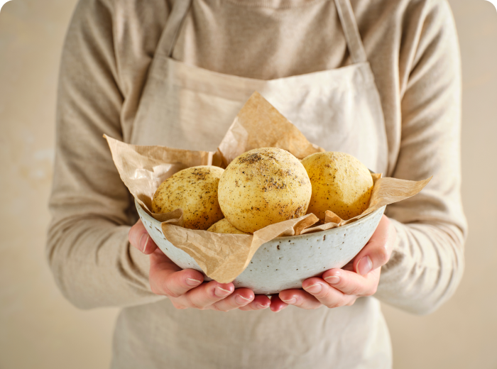 여러 시도 후에, 홍상기 셰프님께 “감자 본연의 맛과 특색을 살린 감자빵을 만들고 싶다”고 부탁드렸어요. 다양한 품종의 감자를 써보고, 익히는 방식도 달리하며 레시피를 다듬었죠. 지금의 감자빵 레시피는 초기와 많이 다르지만, 2가지의 토종 감자 원물이 듬뿍 들어간 감자 모양의 감자빵이 이렇게 탄생했습니다. 드디어 단순한 제품이 아니라, 종자의 다양성을 지키면서도 농촌의 고부가가치 제품이 될 수 있는 길을 찾은 기분이 들더라고요.