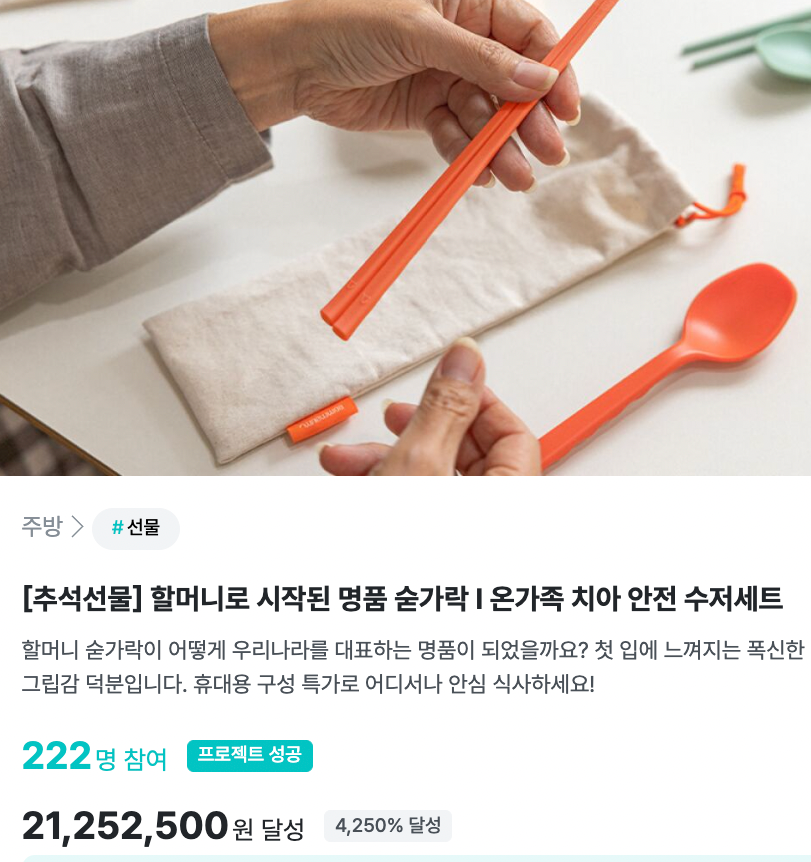 이러한 세심한 배려와 일관된 진심은 고객들의 강력한 신뢰로 이어졌습니다. 그 결과, 첫 와디즈 펀딩에서 2,000만 원 이상의 펀딩액을 달성하는 성과를 거두며, 차근차근 성장하고 있습니다.