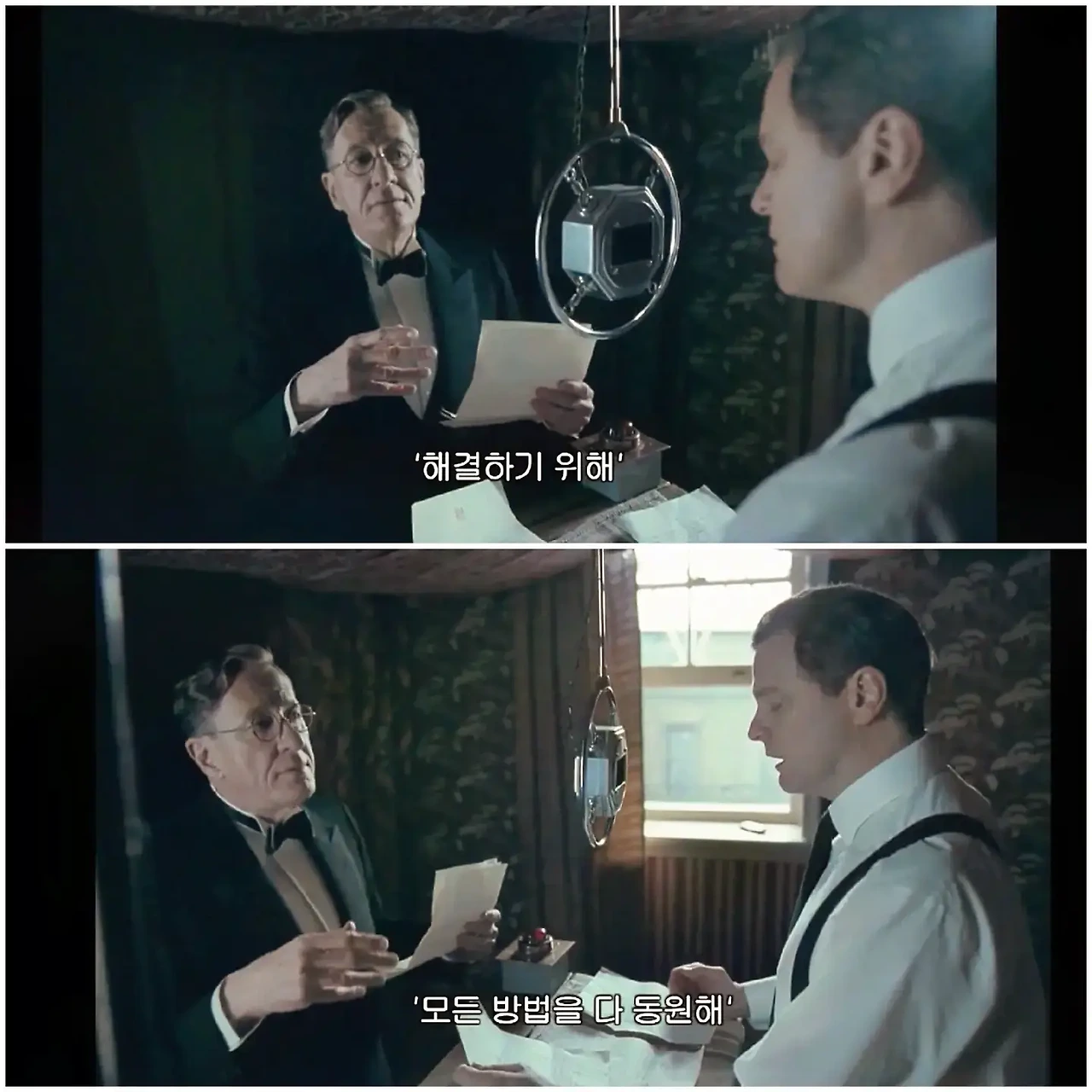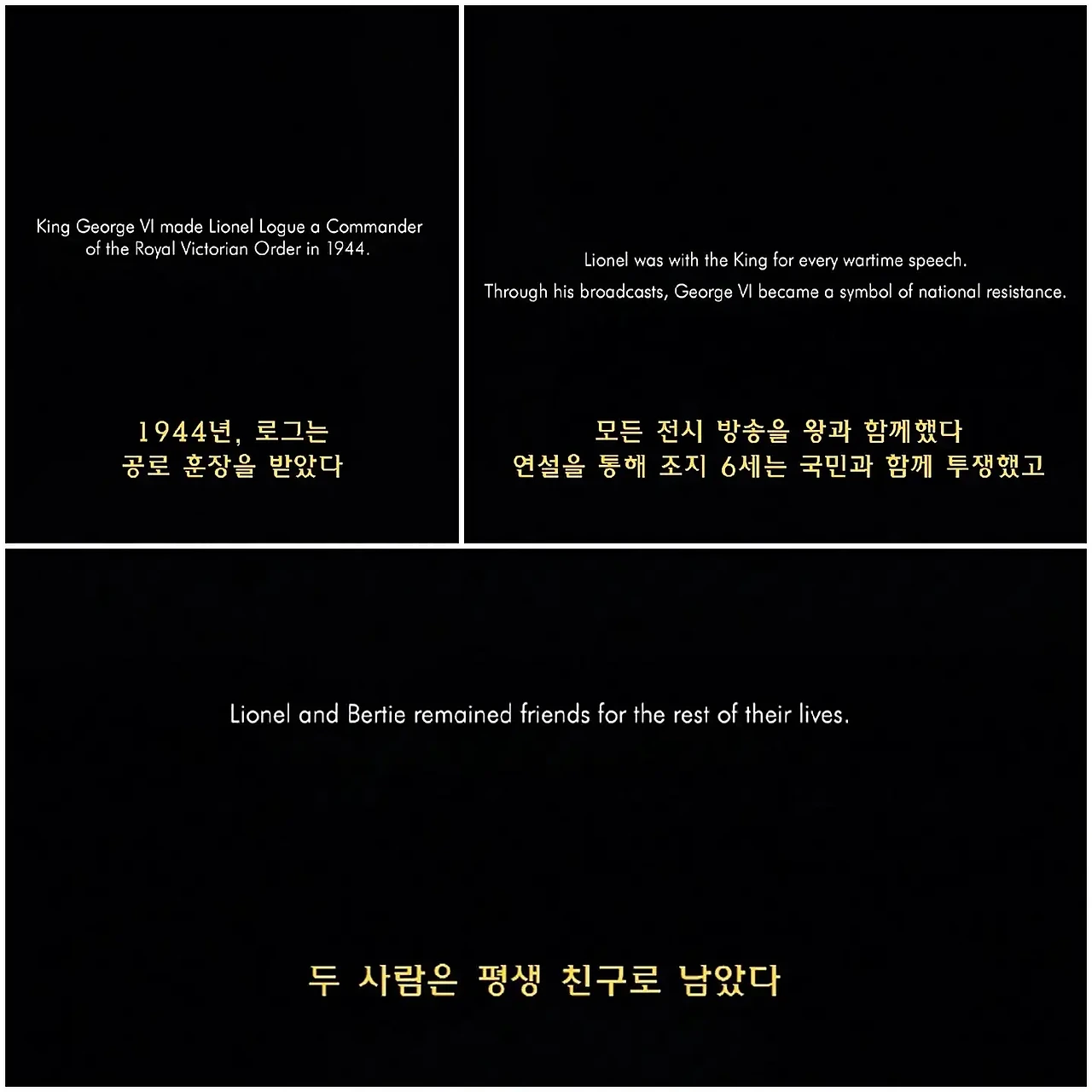두려움에 떨고 있는 국민들에게 국왕으로서 용기와 희망을 전해주는 일생일대의 연설을 하는 동안, 스튜디오 안에는 두 사람만이 함께한다. 코치는 그가 연설을 하는 내내 온 마음으로, 눈으로, 입술로 응원을 한다. 이 장면에서 가슴이 뜨거워졌다. 성공적인 첫 연설을 마치고 조지 6세는 앞으로 자신의 연설에 쭉 함께해달라고 말한다. 그리고 두 사람은 평생 친구가 된다.