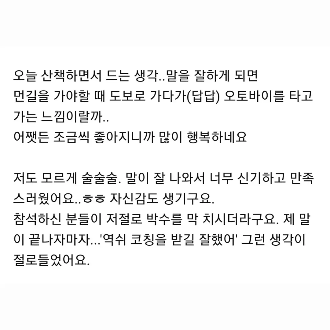 누군가 내게 엄청난 무대에 드레스를 입고 스포트라이트를 받으며 설래? 아니면 말 잘하기를 간절히 원하는 분의 코칭을 할래?라고 묻는다면 주저 않고 후자를 택할 것이다.
