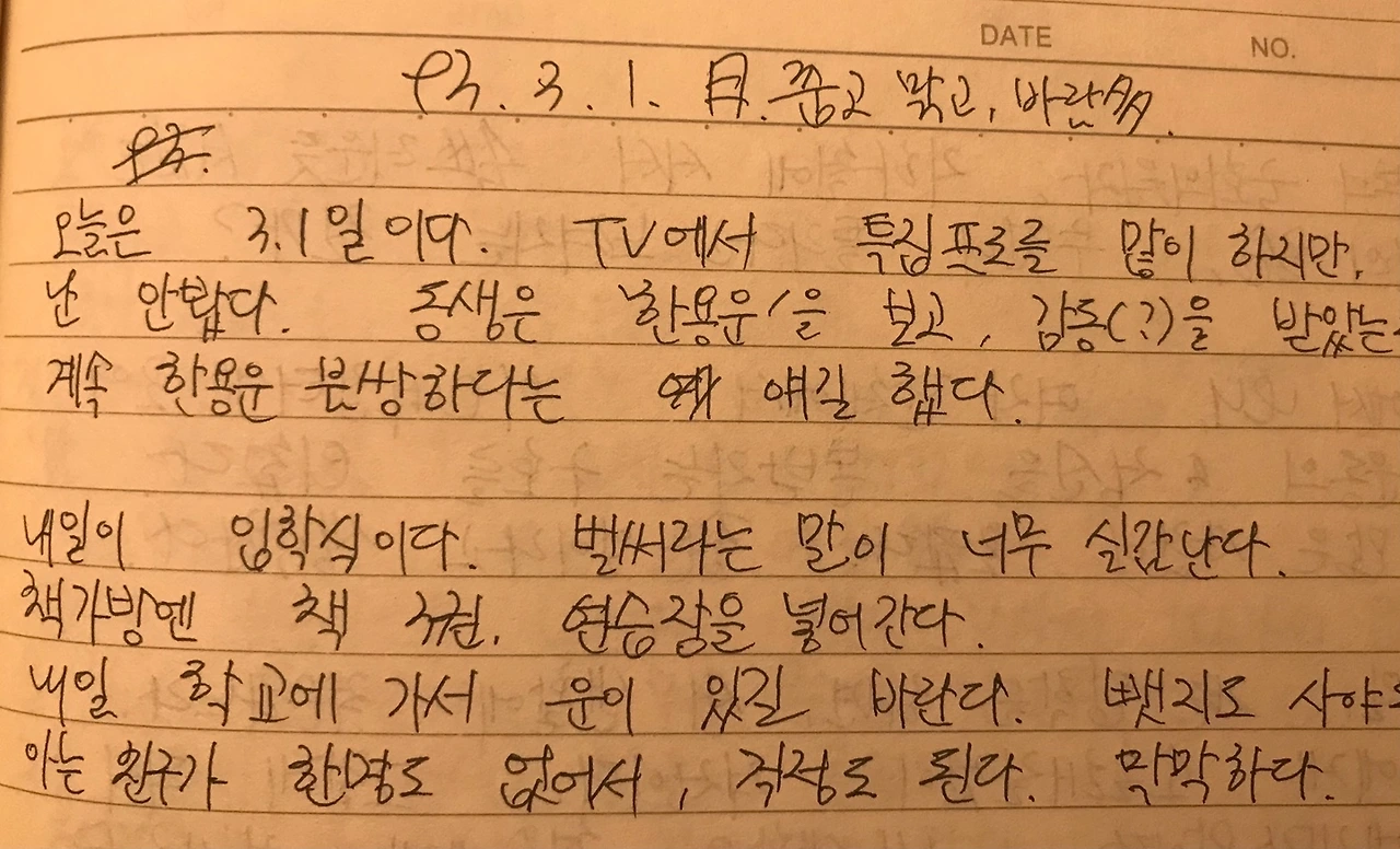 내일이 입학식이다. 벌써라는 말이 너무 실감난다. 책가방엔 책 3권, 연습장을 넣어간다. 내일 학교에 가서 운이 있길 바란다. 뺏지도 사야 되는데. 아는 친구가 한 명도 없어서 걱정도 된다. 막막하다. “