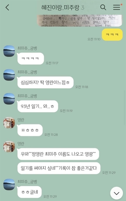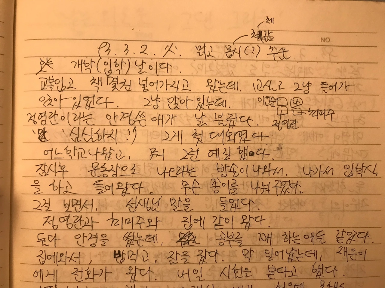 이 둘은 지금까지 내 절친이다. 고등학교 시절 내내 붙어 다니다가 각자의 생활에 몰두하는 20대를 거쳐 이제는 모두 결혼해 아이 낳아 키우며 직장맘으로 지낸다. 호주와 일산, 인천으로 사는 곳도 멀어졌다. 자주 만나진 못해도 단톡방에서 곧잘 안부를 나눈다. 우리가 처음 만난 이날의 일기를 사진 찍어 셋의 단톡방에 올려보았다. 셋 중 이날 일을 기억하고 있는 이는 아무도 없었다. 우리의 과거에 이날의 일이 새로운 기억으로 슬며시 끼어들어 갔다. 과거는 이렇게 매순간 변한다!