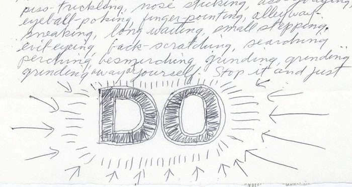 Just stop thinking, worrying, looking over your shoulder, wondering doubting, fearing, hurting, hoping for some easy way out, struggling, grasping, confusing, itching, stratching, mumbling, bumbling, grumbling, humbling, stumbling, rumbling, rambling, gambling, tumbling, scumbling, scrambling, hitching, hatching, bitching, moaning, groaning, honing, boning, horse shitting, hair splitting, nit picking, piss trickling, now sticking assgouging, eyeball poking, finger pointing, alleyway sneaking, long waiting, small stepping, evil eyeing, back scratching, searching, perching, besmirching, grinding, grinding, grinding, grinding away at your self. Stop it and just do!