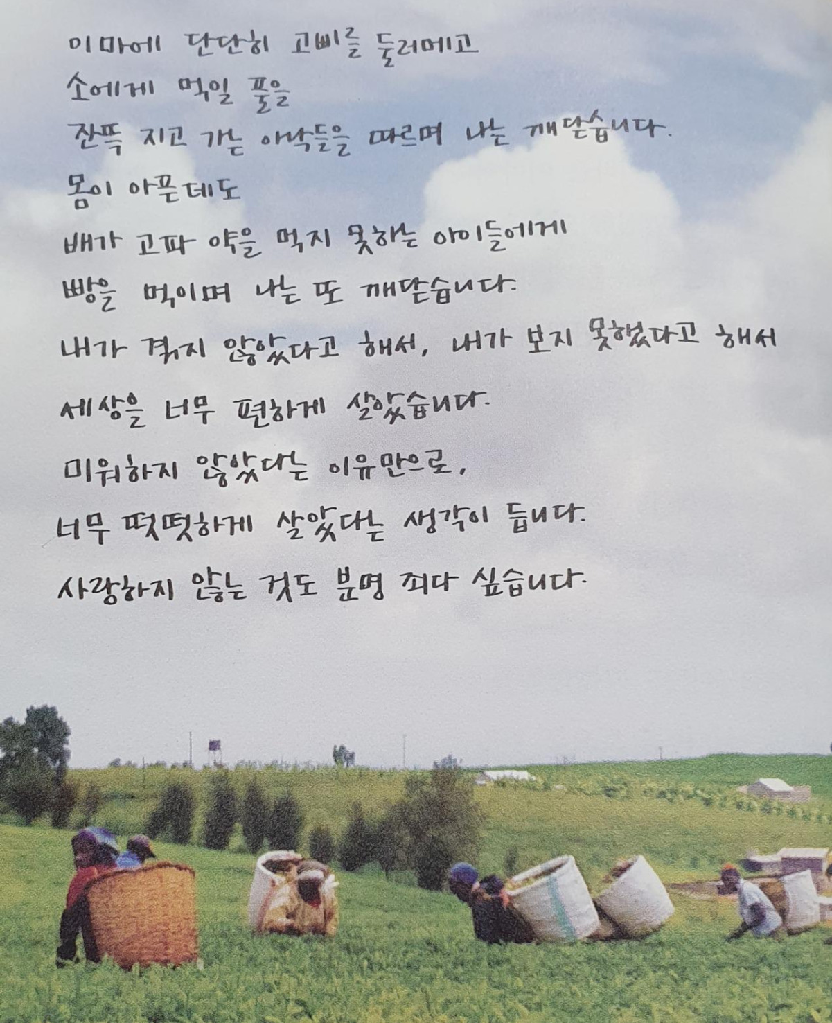 "세상에 없던 마을로 우리는 가고 있다. 아니 세상에 분명 있었으나 우리가 알지 못했던 곳, 한 번도 보지 못한 케냐의 서쪽으로 가고 있다..... 떠나지 않았다면 절대 만나지 못했을 풍경과 사람을 만나는 것. 세상에 존재하고 있는 것을 서로 마주보고 알아봐 주는 것. 우리는 지금 처음 만나는 마을로 간다."(p.198),