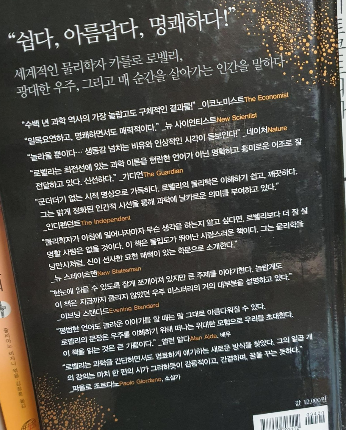 문득 내가 책 편식이 심했다는 것을 깨닫게 해 준 책이었다. 읽고 싶은 책만 읽으면 안 된다는 것을 깨닫게 해 준 책이었다. 생물학자 최재천 교수께서 "통섭적 공부"라는 용어를 썼는데, 여러 학문이 머릿속에서 서로 기대고 통해야 진리에 다가갈 수 있다는 말이다. 카를로 로벨리의 책들도 강제로 통섭적 공부로 이끈다. 물리학자이면서 철학자이고, 시인 같은 표현력과 세밀한 역사 지식에 깜짝 놀란다. 물리학을 이해하는데 철학과 예술의 통섭까지 필요하다니 의아할 수도 있지만 진리로 나아가는 길이 그런 것이다. 반대로 인문학도 자연과학의 통섭을 받아들여야 진보할 수 있다.