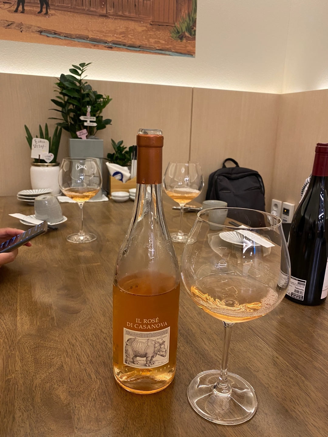 라 스피네따 일 로제 까사노바 로자또(La Spinetta Il Rose dei Casanova Rosato). 일반적으로 로제 와인은 장기 숙성형 와인은 아니지만 어떤 품종과 블랜딩을 하여 만들어지냐에 따라 숙성되면 더 좋은 맛을 내기도 한다. 라 스피네따는 식전주로 마셔도 좋고 과한 양념이나 향이 들어가지 않은 요리와 곁들여도 좋다. 산도가 높은 편이고 자몽, 라임, 복숭아 등의 향이 퍼지는 산뜻한 로제 와인이다. 여름에 손이 가는 그런 가벼운 향수 같은 와인. 알코올 도수가 샴페인과 같아 홀짝거리며 마시에 좋지만 시간이 지날수록 향이 희미해졌다.