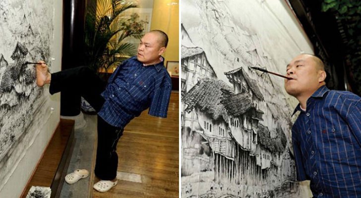 ▼ 하지만 Huang Guofu는 4세이던 해에 전기 감전사고로 양팔을 잃고 오른발과 입을 이용해 그림을 그리는 사람입니다. 그는 12세가 되던 해에 발로 그림을 그리기 시작했고 많은 노력끝에 그림 실력을 향상시킬 수 있었는데 18세가 되던 해에는 자신의 아버지 치료비를 마련하기 위해 거리에서 그림을 그리고 지나가는 사람에게 판매할 수 있었다고 합니다.