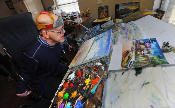 ▼ 하지만 이 그림은 뇌성마비로 태어난 더그 잭슨이라는 사람이 요양원에 머물며 특별히 제작된 머리띠에 붓을 꼽아 머리로 그림을 그린 작품입니다. 그는 자신의 작품을 전시회에 출품할 수 있었고 350명의 관람객에게서 54개 작품중 22개를 판매했다고 합니다.
