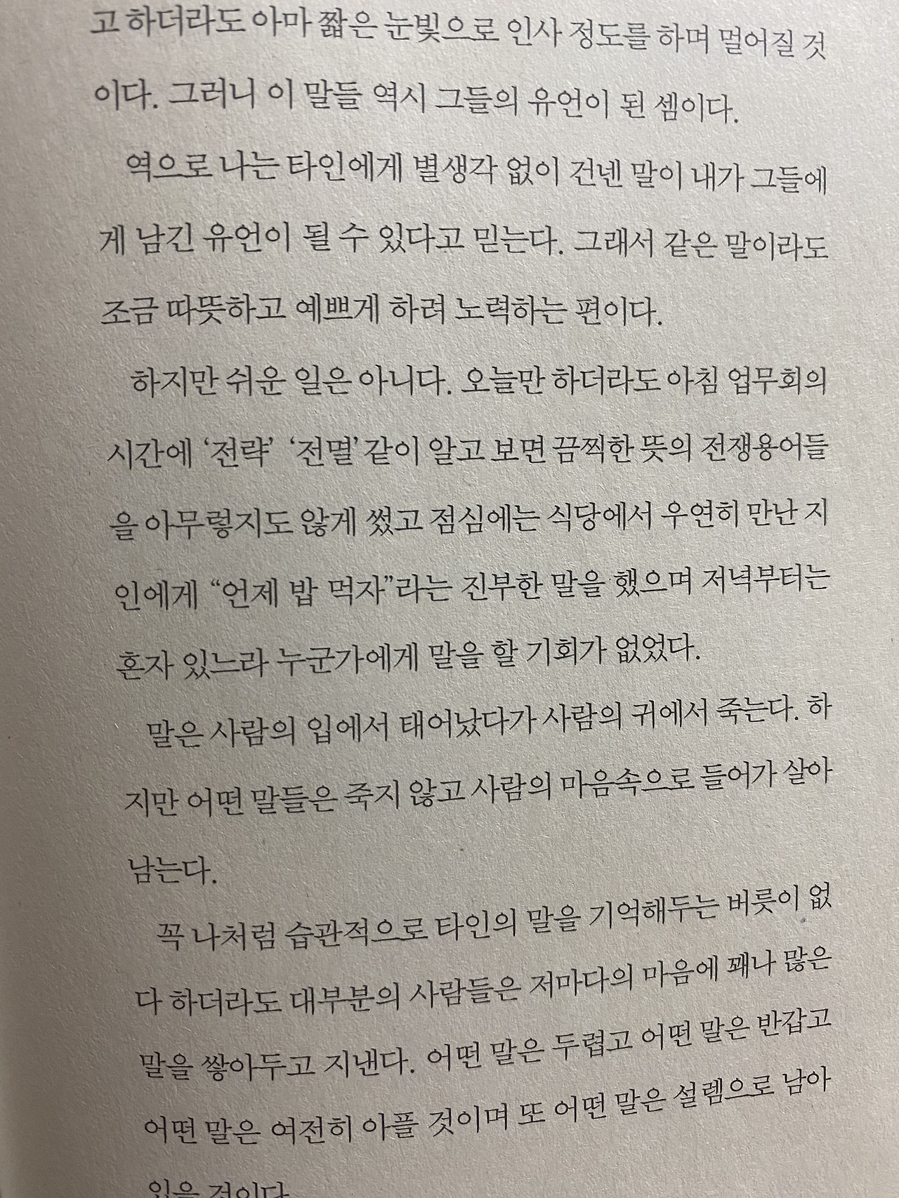 19p. 말은 사람의 입에서 태어났다가 사람의 귀에서 죽는다. 하지만 어떤 말들은 죽지 않고 사람의 마음속으로 들어가 살아남는다. - 어떤 말은 두렵고 어떤 말은 반갑고 어떤 말은 여전히 아플 것이며 또 어떤 말은 설렘으로 남아 있을 것이다.