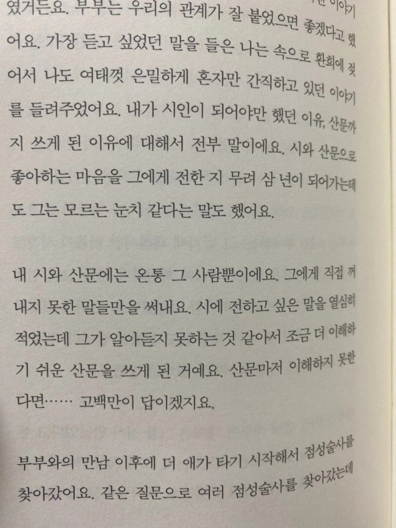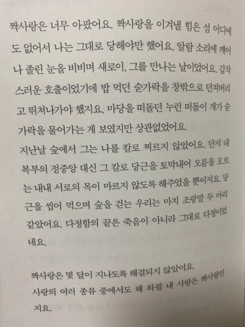 저자는 아무래도 지독한 짝사랑 중에 놓여 있는 듯해 보였다. 아니 놓여 있다. 이 책에서는, '그'라고 지칭하는 상대가 아주 자주 나오는데 과장 조금 보태어 매 장마다 그에게 사랑 고백을 하고 있다. 그는 저자가 머무는 제주에서 함께 하다가도 어느 순간 말도 없이 불쑥 떠나버리기도 하고, 다정하게 잘해주다가도 무심한 태도로 세상 관심 없는 척하기도 한다. 저자의 마음을 알면서도 그에 대한 답변은커녕 마음에 들었다가, 놨다가를 반복한다.