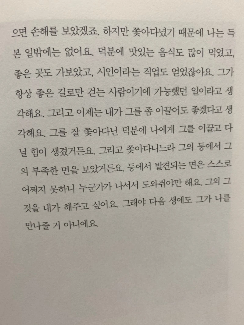 106p. 그를 위해 시인도 됐는데 배우쯤이야 가능했을 테니까요. 배우가 되어서 무슨 수를 써서라도 그를 만나러 갔겠죠. 그리고 직업만 다른 채로, 지금처럼 살고 있겠죠.