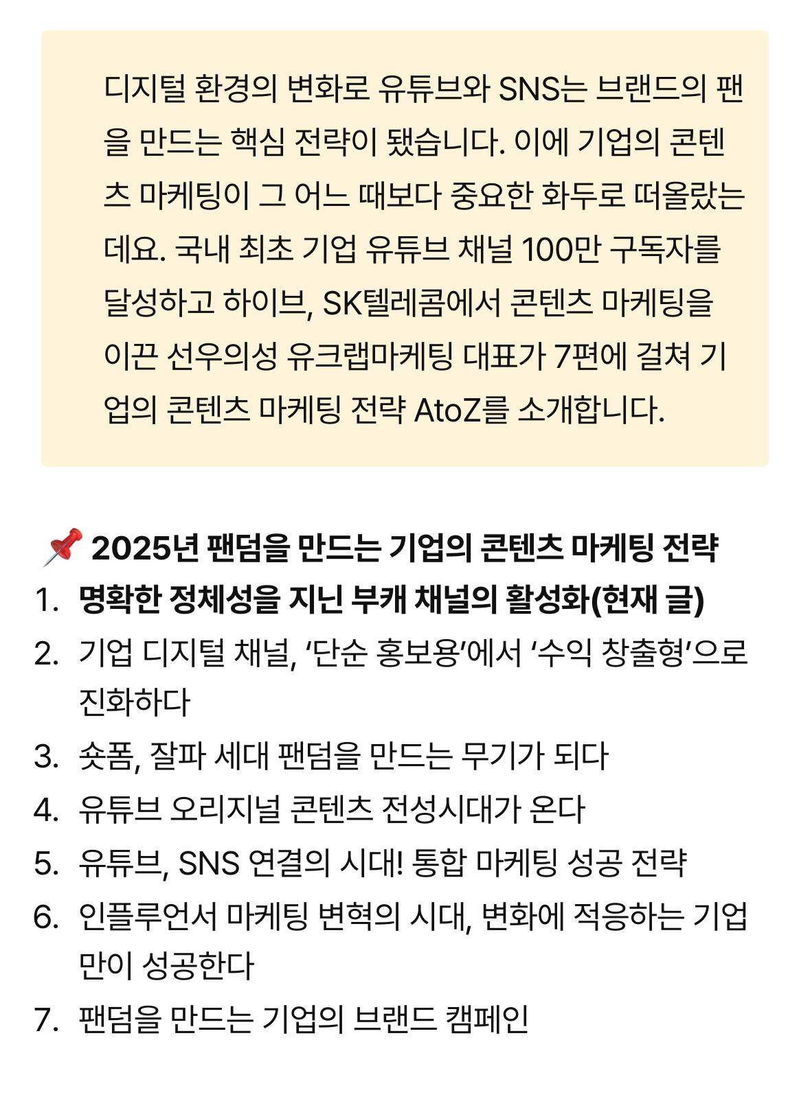 <2025년 팬덤을 만드는 기업의 콘텐츠 마케팅 전략> 시리즈로 총 7개의 시리즈를 연재할 예정입니다.