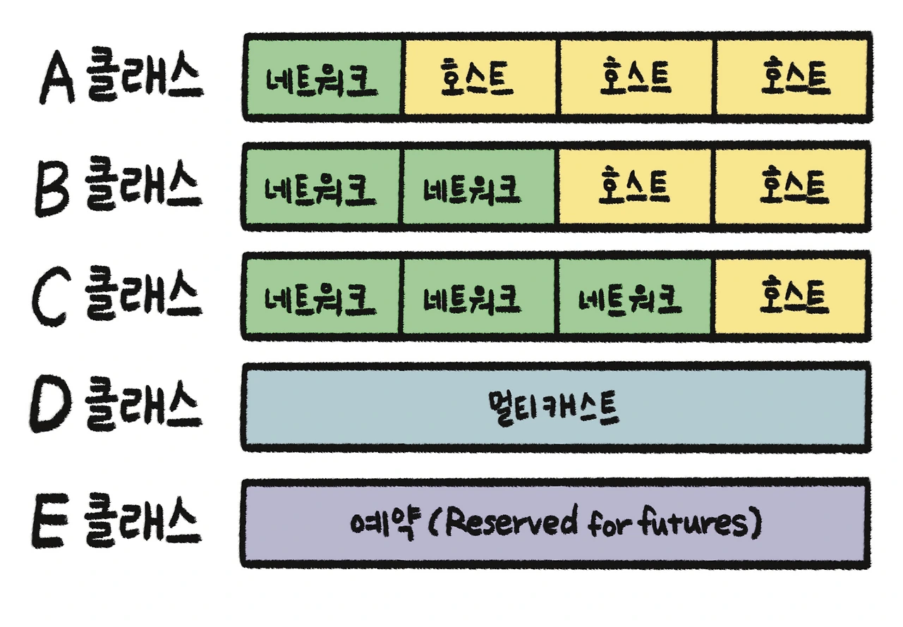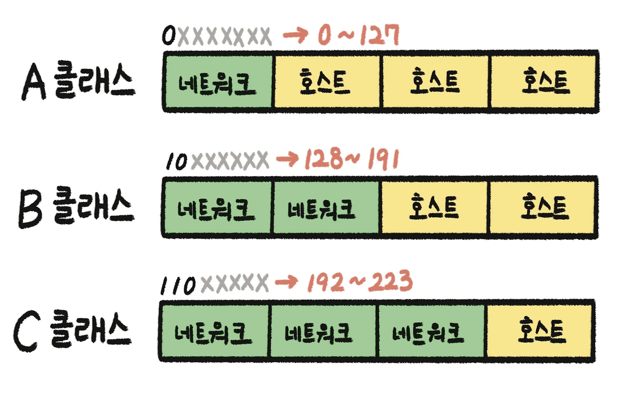 이렇게 네트워크 부분과 호스트 부분을 고정하게 되었을 때의 문제점을 해결하기 위해 IP 주소에서 네트워크 부분과 호스트 부분을 유동적으로 조절하고자 하는 움직임이 생겼고, 그 결과 클래스(class)라는 개념이 탄생합니다.