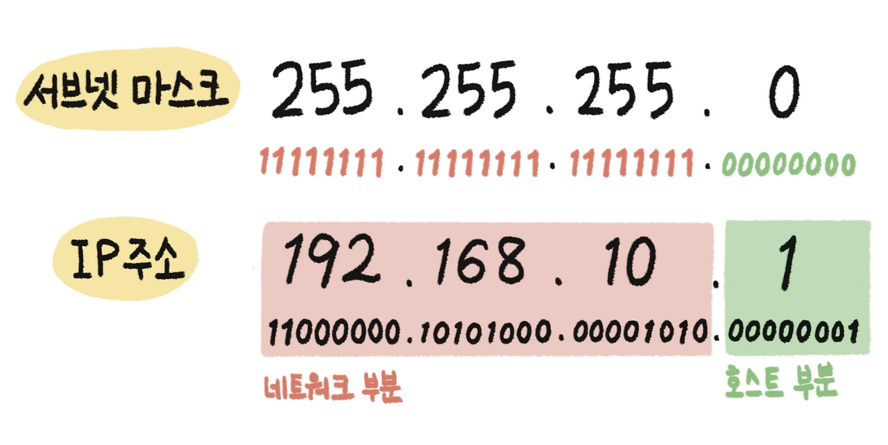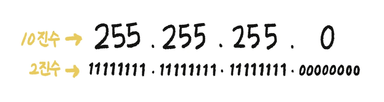 그럼 서브넷 마스크로 어떻게 IP 주소의 네트워크 부분과 호스트 부분을 알 수 있을까요? 바로 서브넷 마스크와 IP 주소를 2진수로 바꾸고 나란히 놓았을 때, 서브넷 마스크의 1이 연속한 자릿수를 IP 주소의 네트워크 부분, 나머지 0이 있는 자릿수를 호스트 부분으로 구분할 수 있습니다.