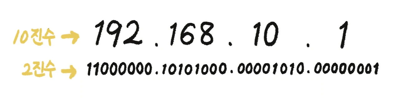 실제 IP 주소로 생각해 볼까요? 만약 192.168.10.1이라는 주소가 있다고 생각해 봅시다.