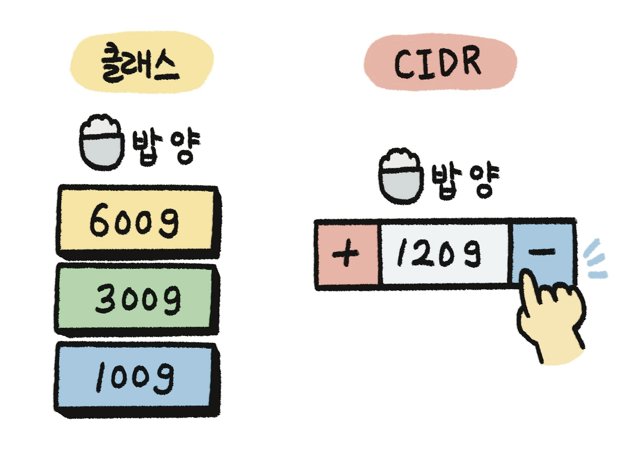 가령 클래스 방식에서는 배식할 때 많이, 중간, 적게 이렇게 3가지 선택지가 주어졌다면 CIDR에서는 거의 한 숟갈 단위로 세세하게 담을 수 있게 된 셈입니다. 이렇게 되면 원하는 만큼만 음식을 받을 수 있으니 먹는 사람도 만족스럽고 버려지는 잔반도 줄일 수 있겠죠.