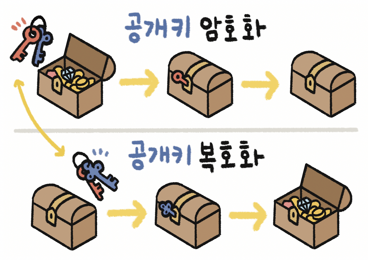이해를 돕기 위해 앞서 설명했던 보물 상자를 다시 가져와 보겠습니다. 공개키의 보물 상자가 대칭키와 다른 점이 있다면 각기 다른 형태인 열쇠 두 개가 한 쌍으로 이루어져 있다는 점입니다. 이해하기 쉽게 각각 빨간 열쇠와 파란 열쇠라고 부르겠습니다. 이때 만약 보물 상자를 빨간 열쇠로 잠갔다면 남아있는 파란 열쇠로만 상자를 열 수 있습니다. 반대로 파란 열쇠로 상자를 잠갔다면 남은 빨간 열쇠로만 열 수 있죠.