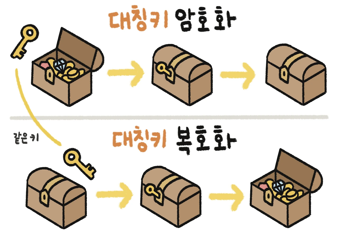 대칭키 기법하나의 키로 암호화와 복호화를 둘 다 할 수 있는 암호화 기법입니다. 예를 들면 보물 상자에 하나의 열쇠 구멍이 있고, 거기에 맞는 열쇠 하나로 보물 상자를 열고 잠글 수 있는 것과 같습니다. 웹 통신으로 생각해보면 클라이언트와 서버가 각각 '1234'라는 키를 갖고 있다가 데이터가 왔을 때 이 키로 복호화를 하고, 데이터를 보낼 땐 같은 키를 가지고 암호화를 해 전송하는 식인거죠.