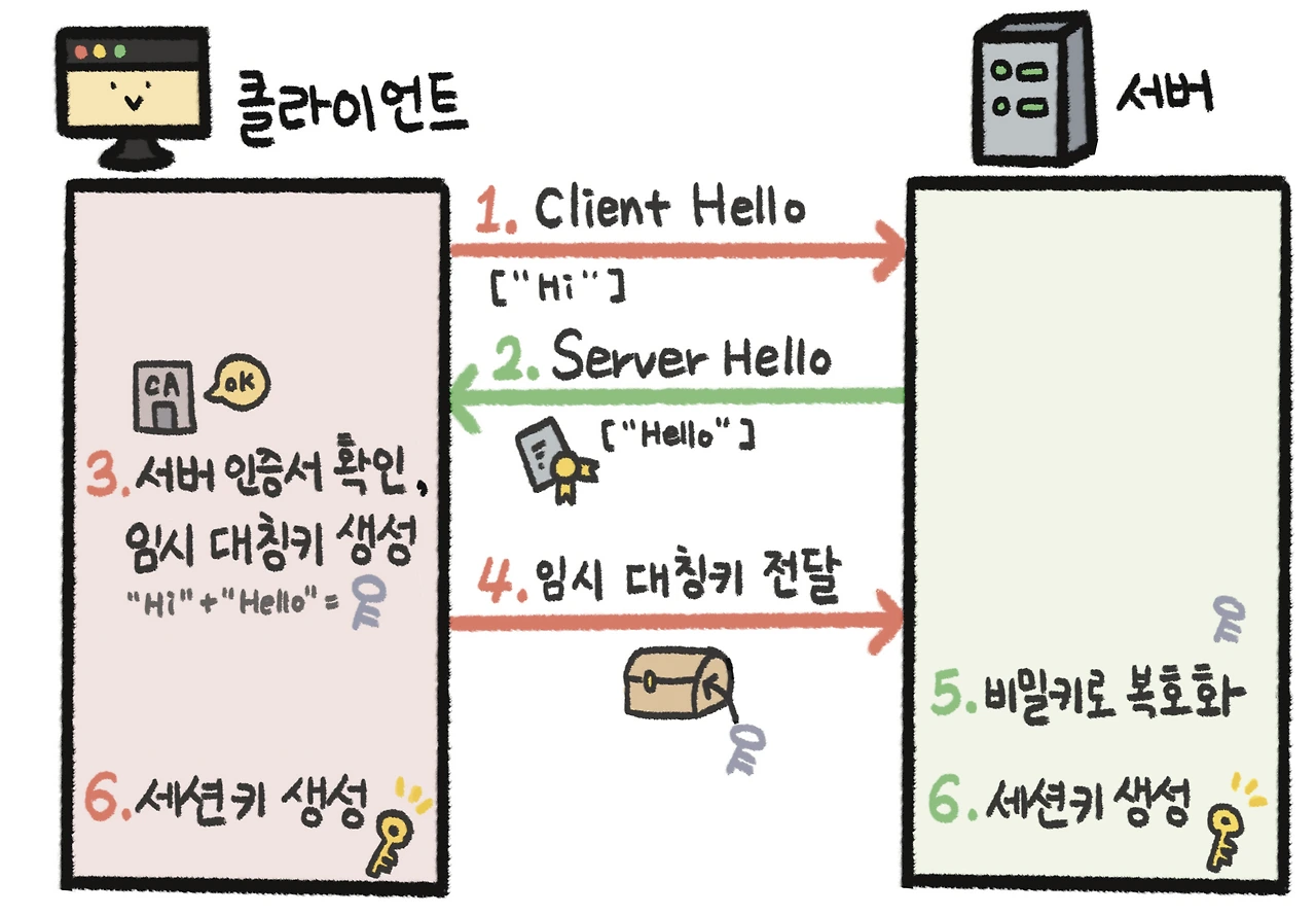 6단계: 클라이언트와 서버의 임시 키는 일련의 과정을 거쳐 세션 키로 바뀌고, 이 세션 키를 이용해 본격적으로 클라이언트와 서버가 통신을 할 수 있게 됩니다.