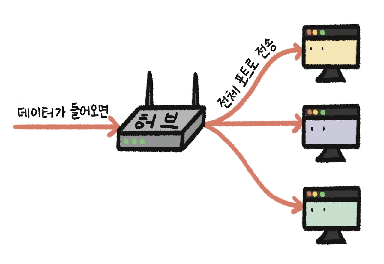 허브(hub)는 스위치보다 먼저 만들어진 연결 장비로, 데이터를 자신에게 연결된 모든 기기에 전달합니다. 가령 인터넷 카페에서 공지사항을 올렸을 때 카페에 가입된 회원이라면 누구나 볼 수 있는 것처럼요. 이처럼 허브는 한 포트에서 전기 신호가 들어오면 이를 허브에 연결된 전체 포트로 연결하는 식이기 때문에 네트워크 전체를 목적지로 데이터를 전송하는 브로드 캐스트(broadcast) 통신 방식으로 볼 수 있습니다.