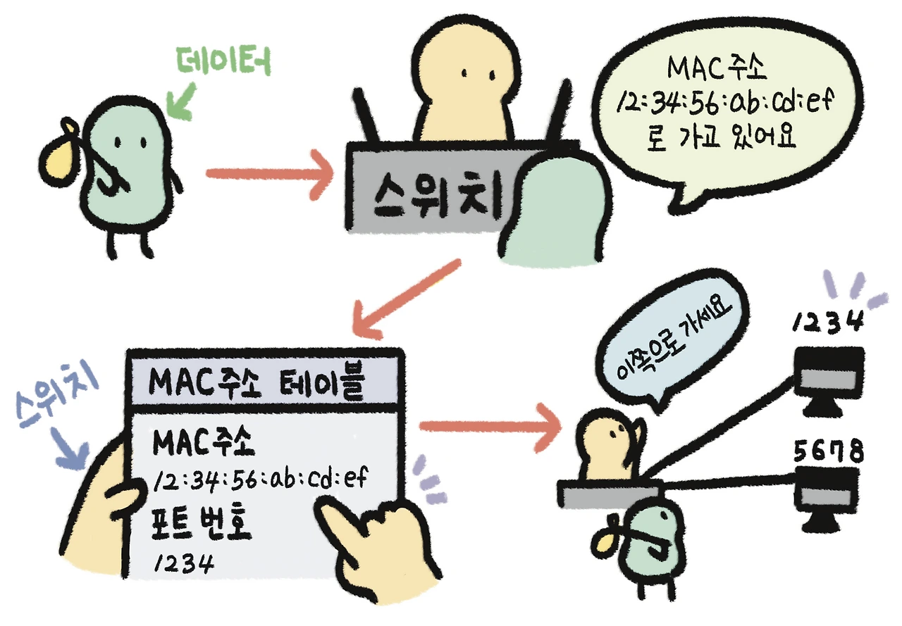 보통 스위치에 연결된 컴퓨터들은 각자 고유한 포트 번호를 갖고 있습니다. 가령 거실에 있는 컴퓨터는 포트 번호 1234번, 동생 방에 있는 노트북은 포트 번호 4321번 식으로 말이죠. 그리고 처음 데이터 통신이 시작되면 스위치는 자신에게 들어온 데이터의 헤더를 보고 목적지의 MAC 주소는 어디이며 포트 번호는 몇 번인지를 확인해 MAC 주소 테이블이라는 공간에 저장합니다. 이렇게 한 번 테이블에 정보가 저장되고 나면 다시 데이터를 주고받을 때, 스위치에서 데이터의 MAC 주소를 확인한 뒤 MAC 주소 테이블을 확인해 주소가 일치하는 기기의 포트로만 데이터를 전송하게 됩니다.