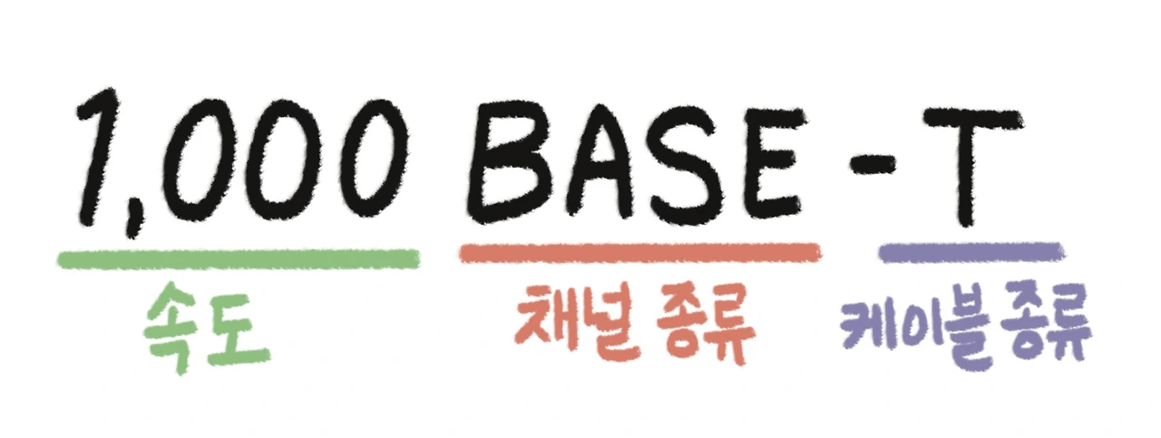 속도뿐만 아니라 어떤 케이블을 사용하는지, 어떤 신호를 사용하는지에 따라 10BASE-5, 1,000BASE-T 과 같은 형태로 이더넷 규격을 정의할 수 있는데요. 자세한 내용은 포스팅 마지막에서 다루겠습니다.