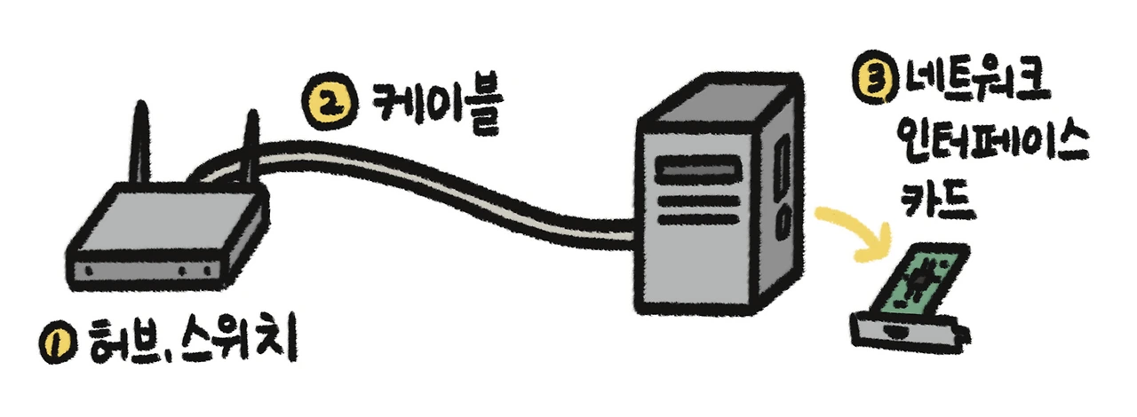 그런데 떡볶이도 여러 가지 종류가 있지만 떡이 없는 떡볶이는 없는 것처럼 가장 핵심이 되는 재료들은 정해져 있는데요. 이처럼 이더넷도 주로 사용하는 구성 요소와 구조가 따로 있답니다. 한 번 자세히 살펴볼까요?