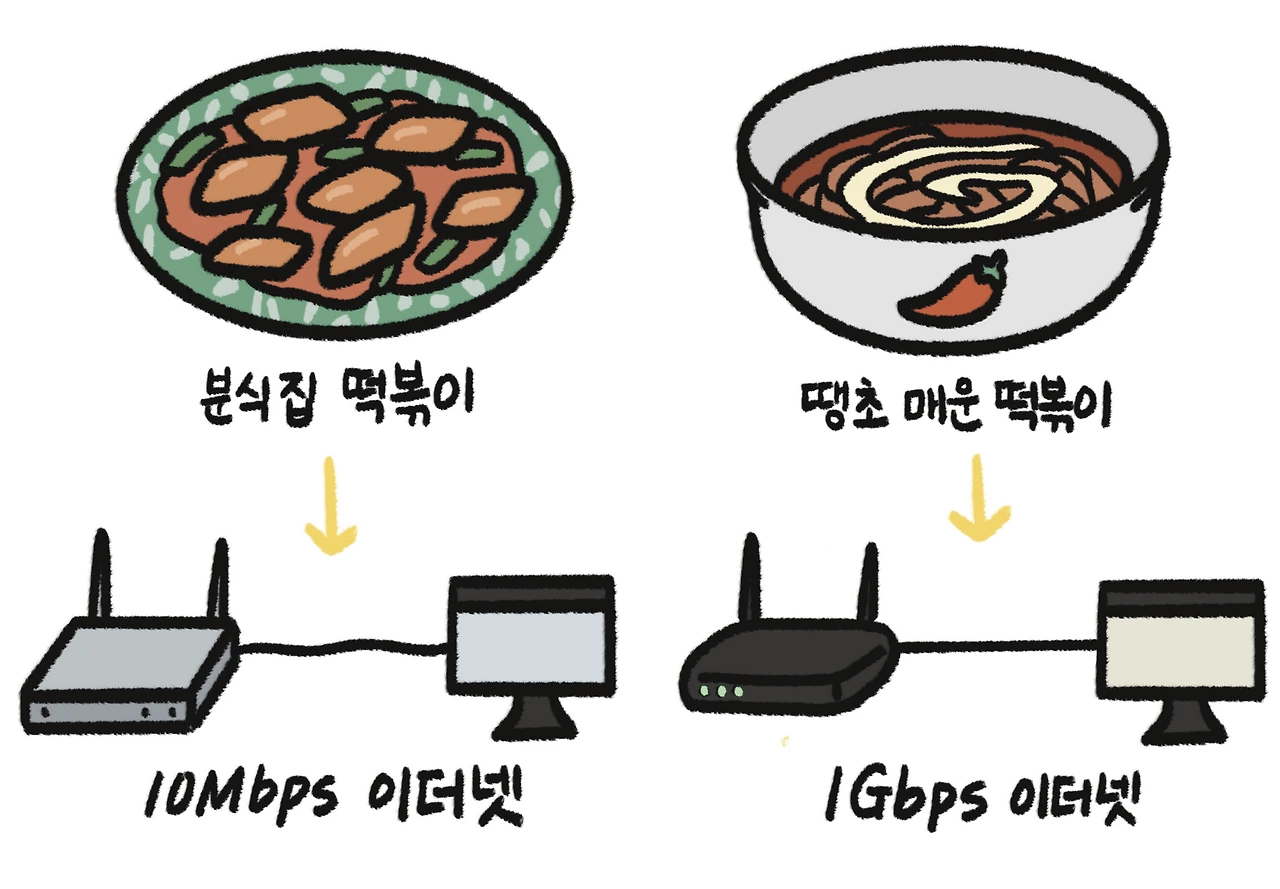 이더넷은 어떤 속도와 어떤 구성으로 설치하는지에 따라 다양한 규격으로 구분할 수 있습니다. 가령 같은 떡볶이라고 하더라도 떡의 종류가 밀떡인지 쌀떡인지, 그리고 맵기 정도는 어떤지에 따라 여러 가지 떡볶이가 만들어지는 것처럼 말이죠. 이처럼 같은 이더넷이라도 상황에 맞는 다양한 선택지가 있으므로 설치하고자 하는 네트워크의 성능과 환경에 따라 필요한 이더넷 규격을 선택할 수 있습니다.