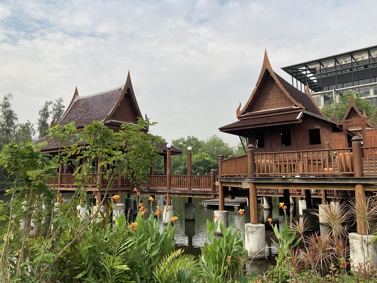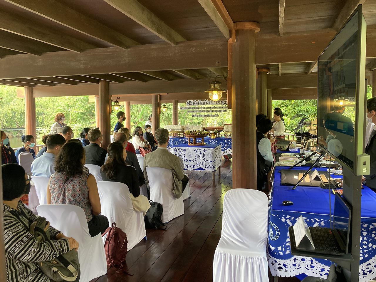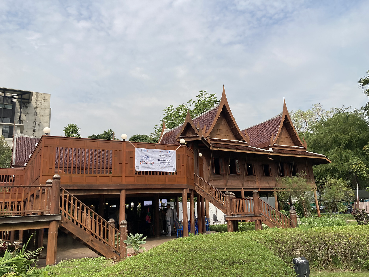 캠퍼스 내 ‘타이하우스’라 불리는 2층짜리 태국 전통 목조가옥이 오늘의 행사 장소였다. 태국 전통가옥은 기둥을 세워 건물 바닥이 땅에서 떨어져 있는 형태로, 뜨거운 지열이 바닥으로 올라오는 것을 막아준다. 1층(말하자면 필로티 구조 건물의 주차장) 공간은 그늘이 생기는 동시에 통기성이 좋아져 더위를 피할 수 있다. 오늘 기온이 높지 않고 바람도 선선해서 이 공간의 장점을 배로 느낄 수 있었다.