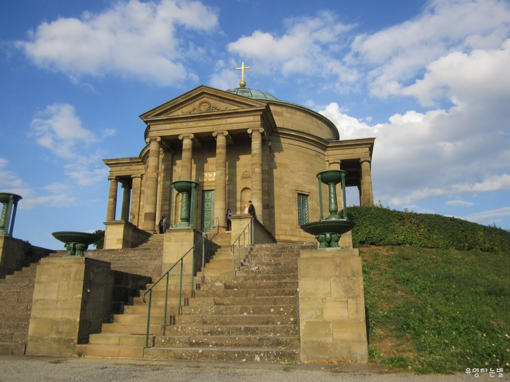 계속 농장을 걷다 보니 꼭대기에 예쁜 건물이 보인다. 조금 가까이 가보니 보이는 십자가, 샤펠(예배당)이었다. 건물이 너무 예뻐 무작정 샤펠을 향해 걷다 보니 근 3시간을 꼬박 걸었다. 샤펠은 5시 폐관이었는데 4시 50분에 도착한 나는 입장이 불가했고, 입구에서 내부 모습을 사진 찍을 수밖에 없었다. 나중에 알게 된 이름은 영묘 예배당(Sepulchral Chapel). 일찍 죽은 왕비의 넋을 기리기 위해 왕이 왕비를 위해 만든 샤펠이란다. 세계 어디에나 로맨틱하고 돈 많이 드는 역사는 존재한다. 아무튼 그런 로맨틱한 사연이 있는 곳이라 그럴까. 때마침 결혼식을 하러 온 커플이 있다. 결혼식은 이미 올렸는지 부부와 하객들은 카메라 앞에서 모두 환하게 웃고 있다.